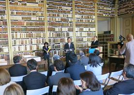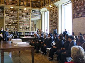 式典では、東博史大使の挨拶に続き、谷垣会長による両図書館長へのレプリカ贈呈及び挨拶、シャヴィエル文化担当副大臣による挨拶が行われました。今回の式典では、日本とポルトガルの歴史的な関係を象徴する下張り文書の重要性が確認されるとともに、今後、文書修復プロジェクトを通じた両国間関係の一層の深化が期待される旨強調されました。 最後にレプリカが保管される桐箱に関係者が署名を行い、贈呈式は閉会を迎えました。
